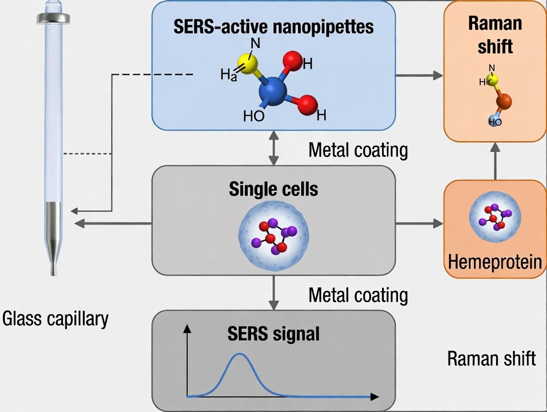This article provides a comprehensive examination of Surface-Enhanced Raman Scattering (SERS)-active nanopipettes as transformative tools for detecting hemeproteins in single cells. Targeted at researchers, scientists, and drug development professionals, we explore the foundational principles of nanopipette fabrication and SERS enhancement. The content details step-by-step methodologies for functionalization and intracellular application, addresses critical troubleshooting and optimization strategies for signal consistency and cell viability, and validates the technique against established methods like mass spectrometry and fluorescence. The discussion concludes by synthesizing the technique's potential to uncover cellular heterogeneity and its implications for advancing diagnostics and therapeutic development.