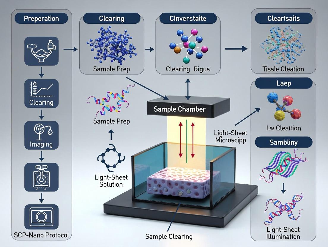 The SCP-Nano protocol represents a significant advancement in tissue clearing, offering a robust, scalable, and reproducible pipeline for acquiring high-resolution 3D biological data via light-sheet microscopy. By mastering its foundational principles, meticulous application, and optimization strategies, researchers can unlock unprecedented views of tissue architecture and cellular networks. Validated against other leading methods, SCP-Nano excels in its balance of performance, practicality, and sample preservation. The future of this technology lies in its integration with spatial omics, machine learning-based analysis, and automation, promising to accelerate discoveries in disease mechanisms, drug target validation, and the development of next-generation diagnostics and therapeutics. Its adoption is poised to become a cornerstone in quantitative, systems-level biology and translational research.